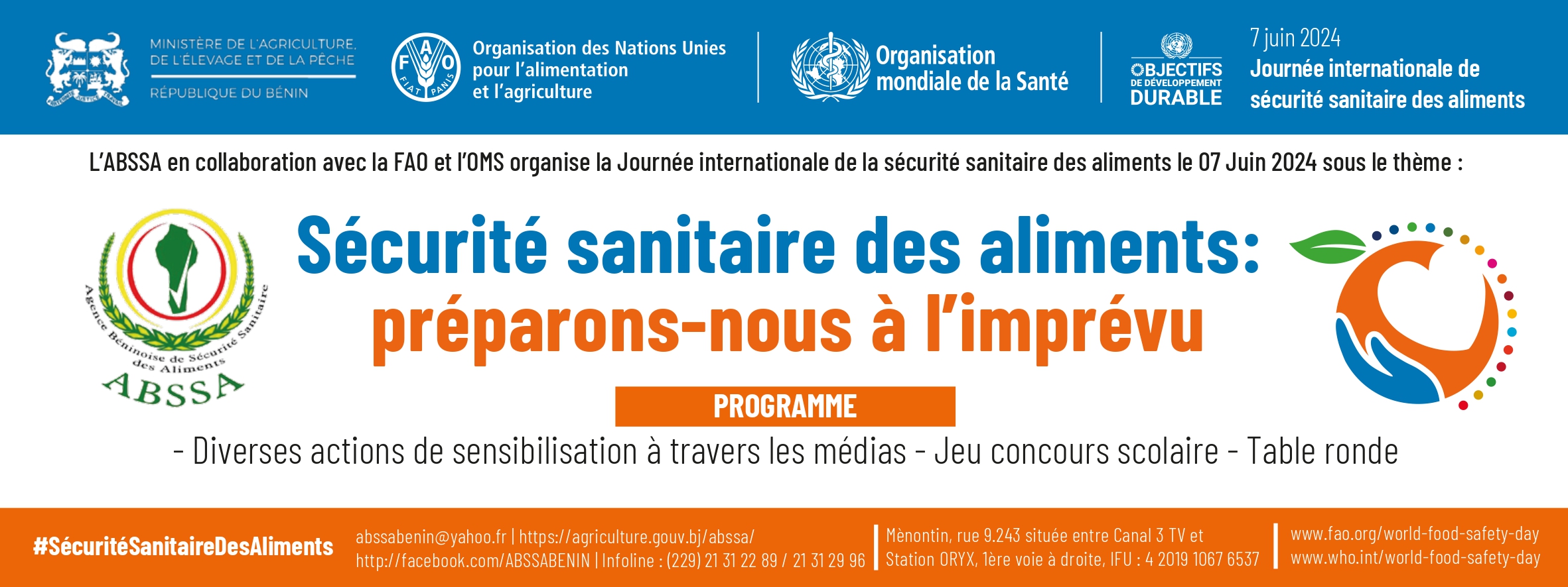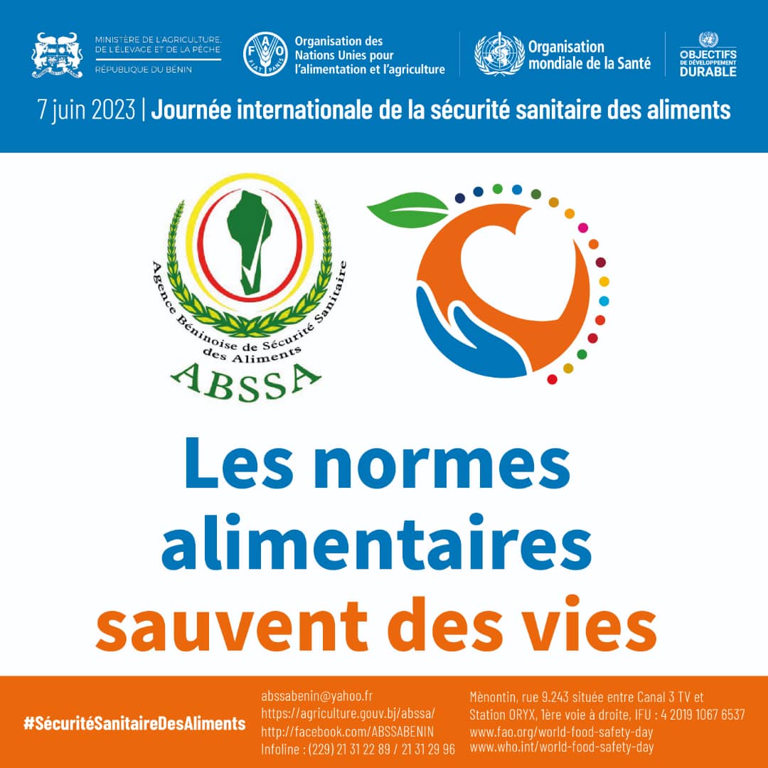 Au regard de ses attributions, en particulier « la communication sur les risques sanitaires liés aux aliments », l’Agence Béninoise de Sécurité Sanitaire des Aliments (ABSSA) est l’autorité compétente chargée d’organiser au niveau national, cette journée en collaboration avec les organisations internationales à savoir l’Organisation Mondiale de la Santé (OMS) et l’Organisation des Nations Unies pour l’Alimentation et la Nutrition (FAO).